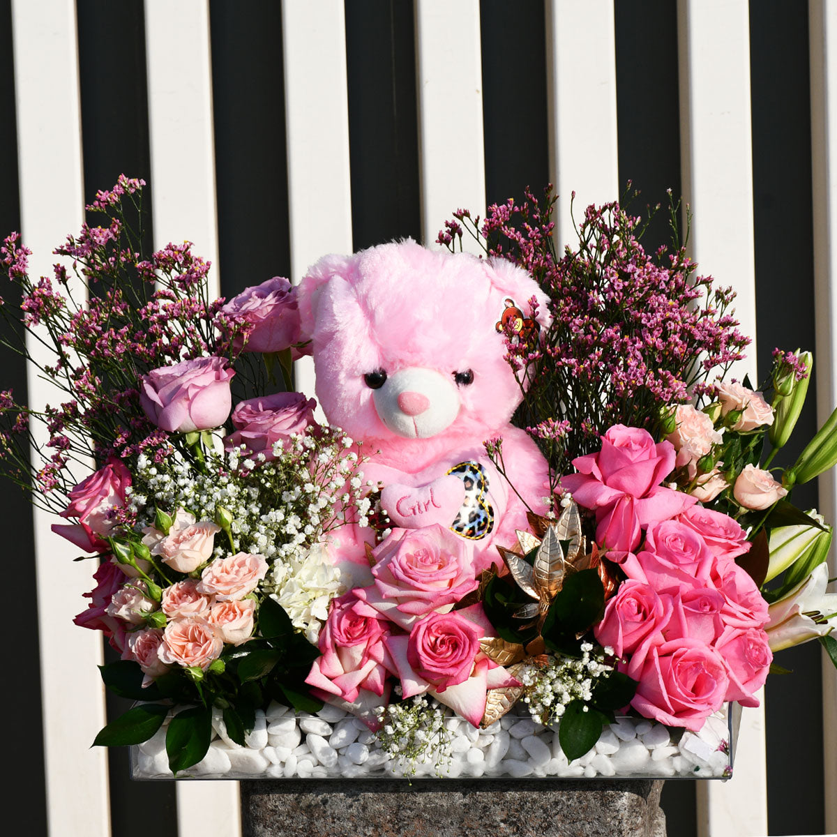 This idea brings a sense of joy and sweetness to the event, combining the charm of soft toys with the natural beauty of flowers. The combination of a plush teddy bear surrounded by vibrant blooms makes for an eye-catching centerpiece or gift display.