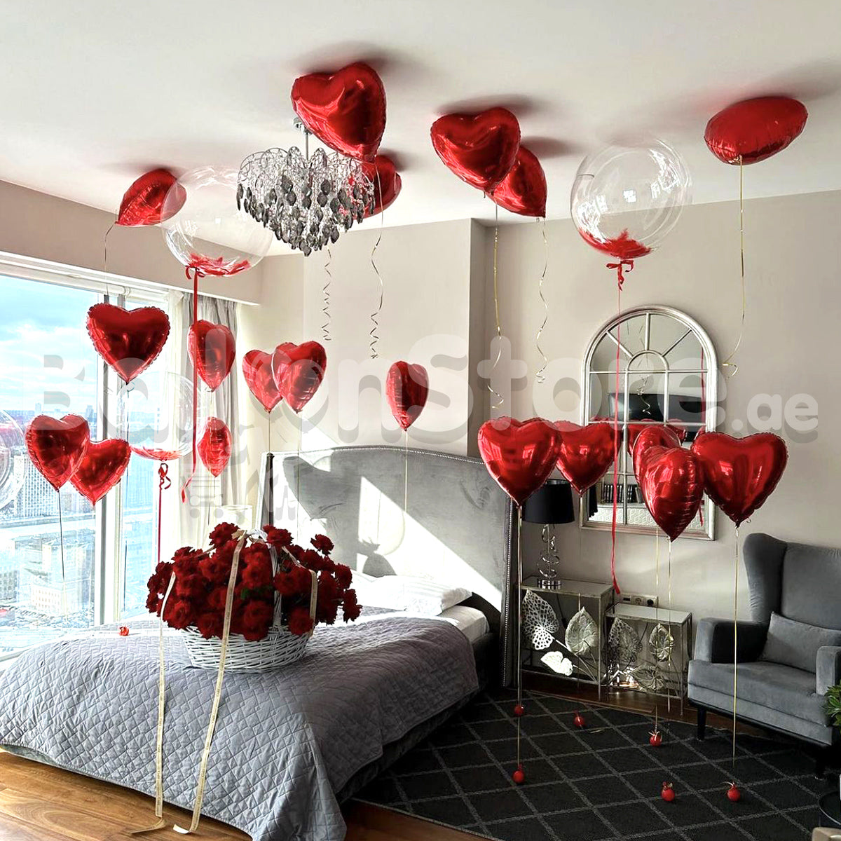 Create a romantic setting with heart-shaped balloons paired with a basket of fresh flowers. Balloons floating gracefully above the bed add a playful and cheerful touch to the room, while the flowers bring elegance and beauty.