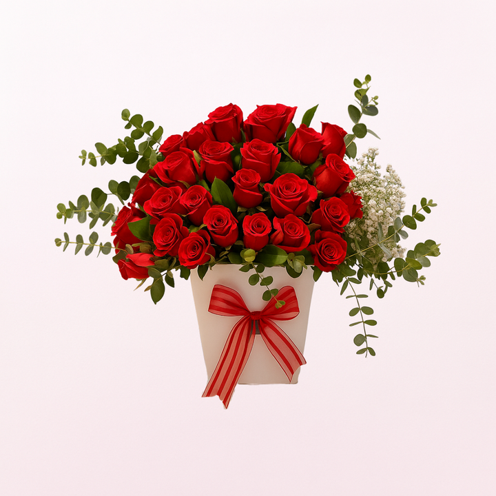 The blossoms are the language of adoration, which whizzes your feelings in your cherished one's heart. Offer your joy with your darlings through birthday flowers, anniversary flowers, congratulations flowers. Enhance the existence snapshots of your friends and family with the combination of sweet, bewitching and elegant Red roses accessorized with rich green Eucalyptus and fresh gypsophila. Flowers are the best to express your adoration and warmth to your friends and family. Convey your love fresh and a hand-picked bunch of blended with mixed beauties on small native basket.