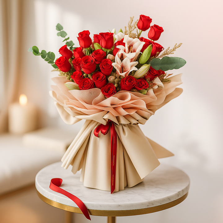 Gift your loved ones an appealing bouquet with a combination of exquisite roses and regal lilies. Handpicked flowers wrapped with love and care.
