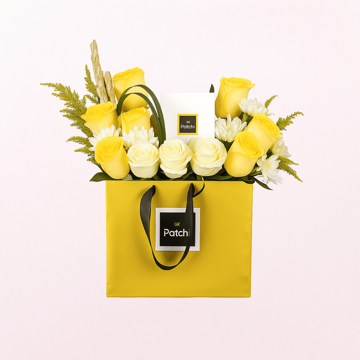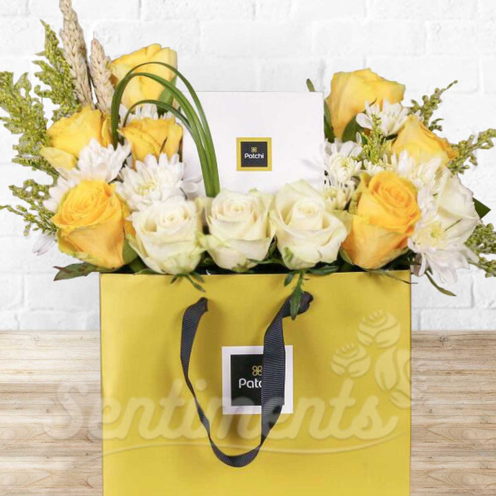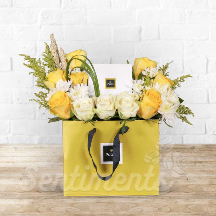 Bag of Sweetness and Roses Flower Arrangement with Patchi Chocolate