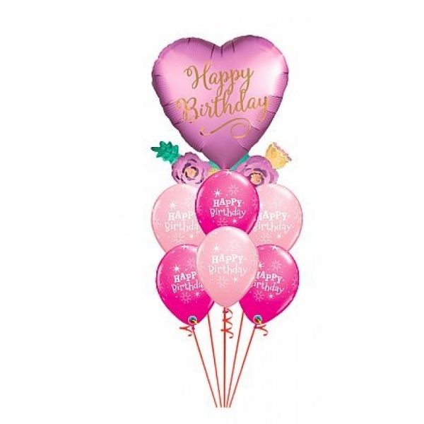 Birthday Satin Hearts with Flowers and Pink Bday Sparkle Balloon Bouquet