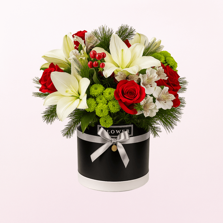 The Christmas joy bouquet will be devoid of all worldly feelings and fall in love with its beauty at the first sight. This bouquet is the wonderful centerpiece on your table, which gives the spirit of the festive mood to all. A stunning black basket full of red roses, beautiful white lilies, cute little green poms, pleasant Christmas tree leaves and tied with wonderful white satin ribbon gives the pleasant and happy mood to this special occasion.