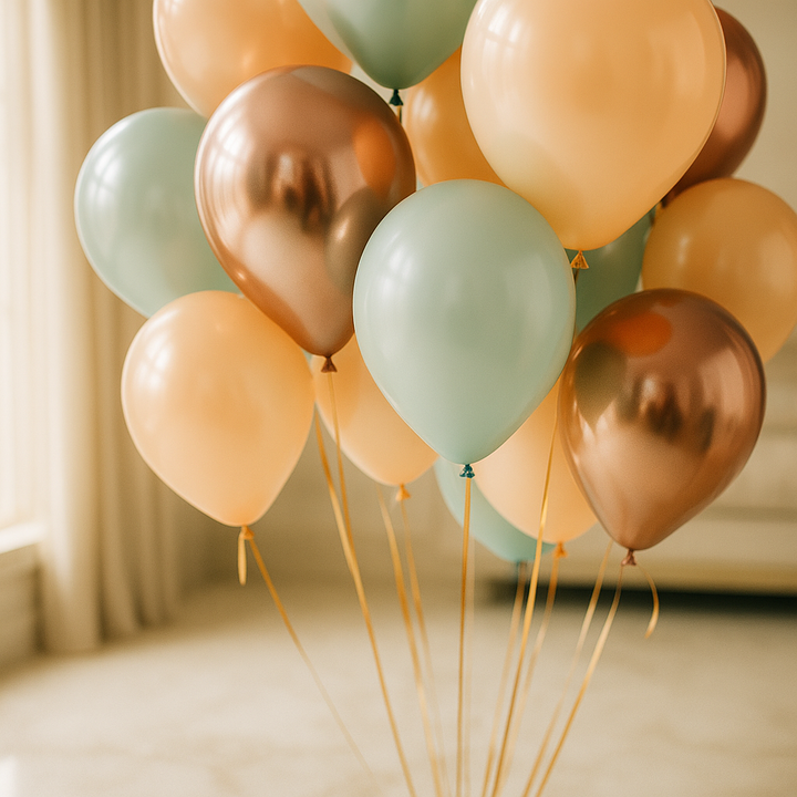 Chrome RoseGold Mint Helium Balloons - Mix of Chrome RoseGold, Pastel MintGreen and Blush Latex with String & Ultra Hi-Float