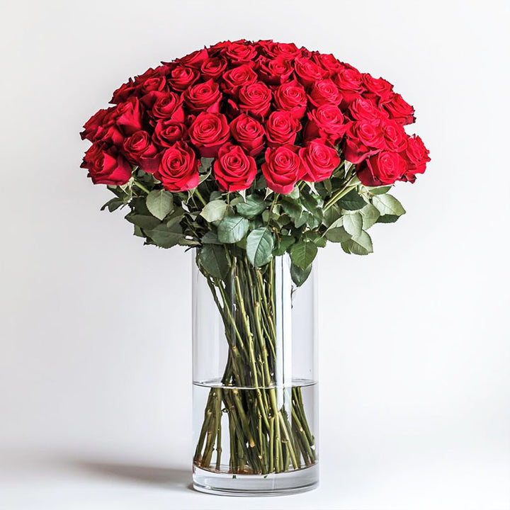 Classy Love Red Roses Fresh Flower Arrangement on a Glass Vase