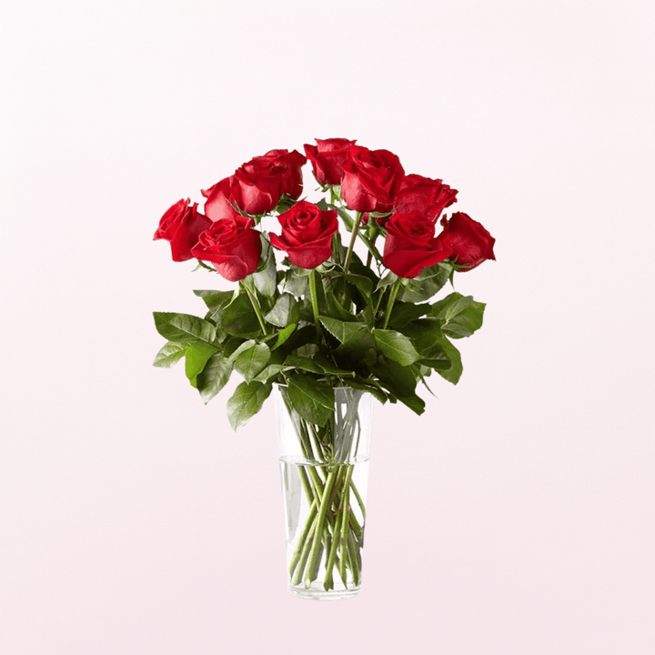 Dozen of Love Red Roses Fresh Flower Arrangement on a Glass Vase
