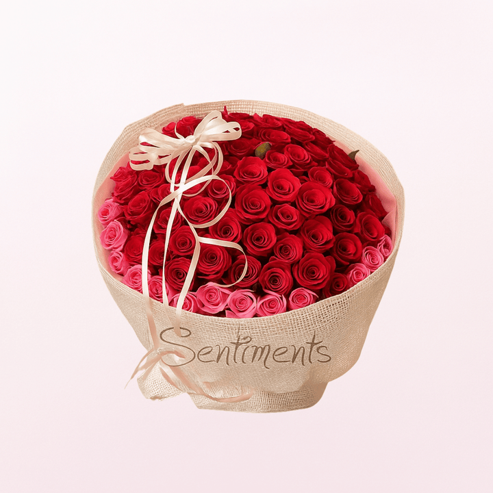 One hundred one of the most exquisite, long-stemmed, large-headed red Roses will be arranged by hand to create this stunningly intense, opulent display. Finished with pink rose lining, this beautiful gift will remain in their heart forever. 101 roses. Red roses bordered with pink roses wrapped with natural jute in an aqua pack.