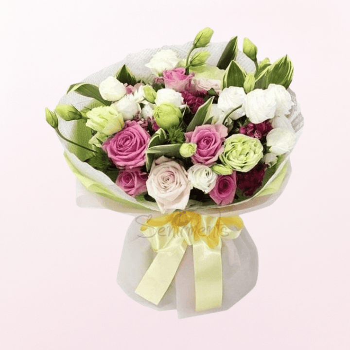 Hand-tied bouquet in classic white and pink shade includes roses Eustoma and Seasonal Greenery. Expertly designed using the finest fresh flowers.