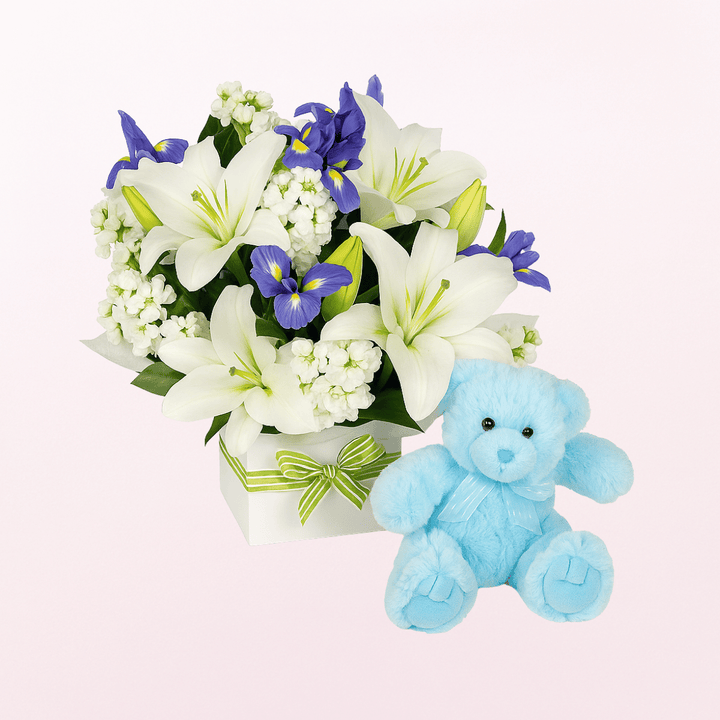 White lilys , roses, gerberas with a touch of blue arranged in basket or oasis pack with blue teddy bear suitable for new born baby boy.