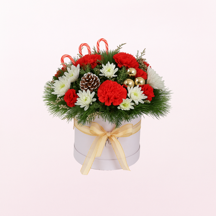 The heavenly white basket consists of stunning red carnesia, white daisies, Christmas tree leaves, Santa's stick and Christmas bells tied with wonderful sandal satin ribbon. Presenting this bouquet will gather all your loved ones to the Christmas Eve.