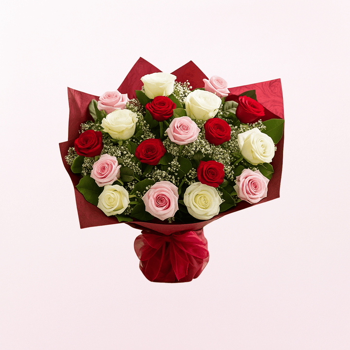 Elegant Upper Class 6 red,6white and 6 pink Roses are beautifully complemented with deep seasonal green leaves creating a simple but stunning romantic bouquet, with wrapping and Ribbon. 18 rose bouquet.
