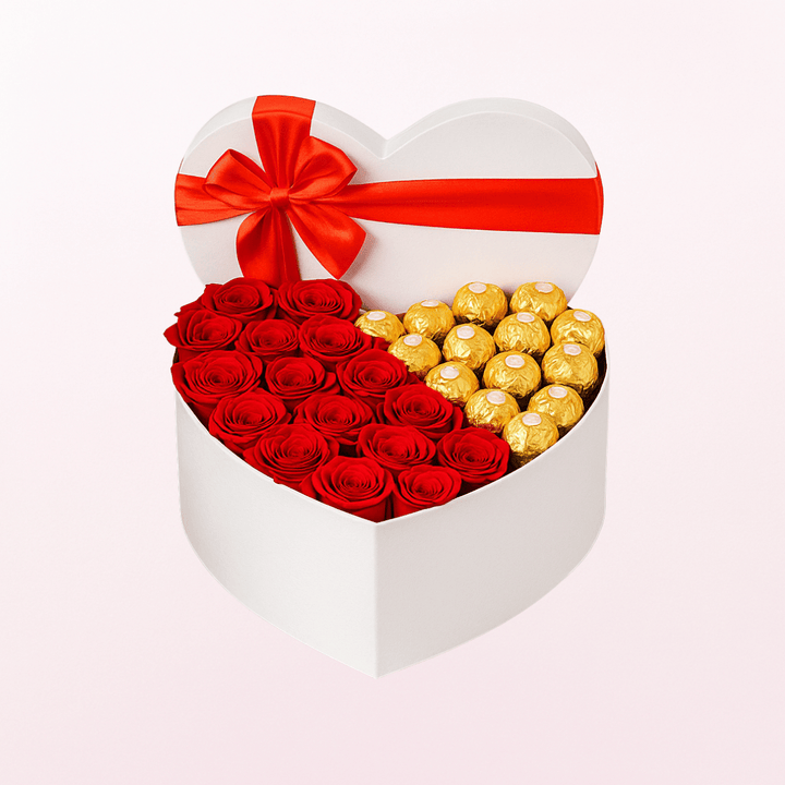 The token of love, the ultimate heart shape passion red roses arranged with Ferrerro Chocolates in a white heart shape box ideal to your loved ones to impress them.