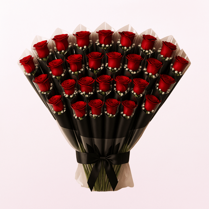 This product includes multiple single red roses, and each rose is individually wrapped in a matte-black cone with gypsophila. The roses shown together in the image are arranged only for visual presentation. The box is not included. You will receive the roses as separate single-stem pieces, all individually wrapped, neat, clean, and ready to hand out. This is ideal for bulk gifting, events, surprises, corporate distribution, schools, or any occasion where you need many single wrapped roses delivered together. If you need other colors like pink or white, you can message us anytime for custom quantities as well.